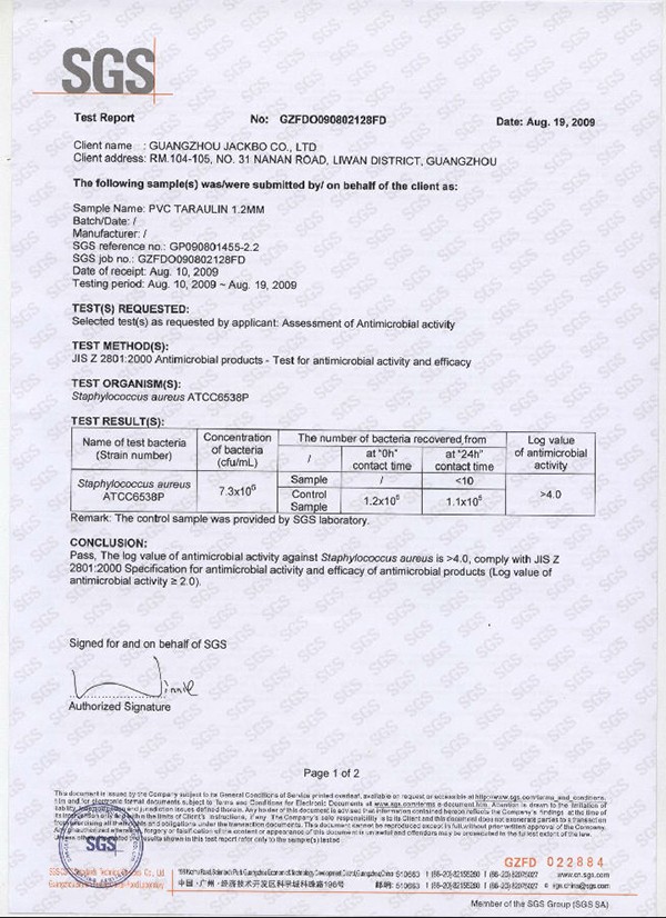 防水膜認(rèn)證證書(shū)-抗菌性能1